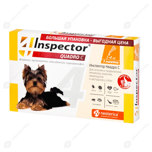 Инспектор Quadro на холку для собак до 4кг (в уп. 3пип.) с 7 недель от блох, клещей, нематод, дироф.