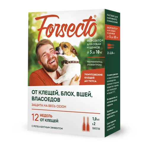 FORSECTO®- инсектоакарицидный препарат обладает выраженной активностью в отношении личиночных и половозрелых фаз развития блох, вшей, власоедов, иксодовых клещей, комаров. Выпускается в 2-х индивидуальных ПИПЕТКАХ (монодозах), с усиленным составом ДВ, благодаря чему обеспечивает наибольшую длительность защиты на рынке.