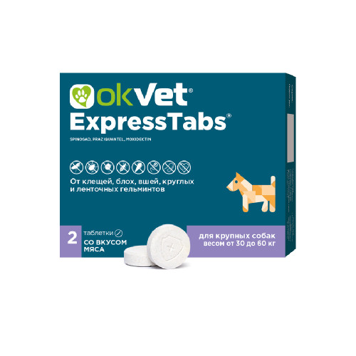 - Оквет экспресстабс для собак от клещей, блох, вшей, круглых и ленточных гельминтов 15-30кг 2 таб. 2 995 р.