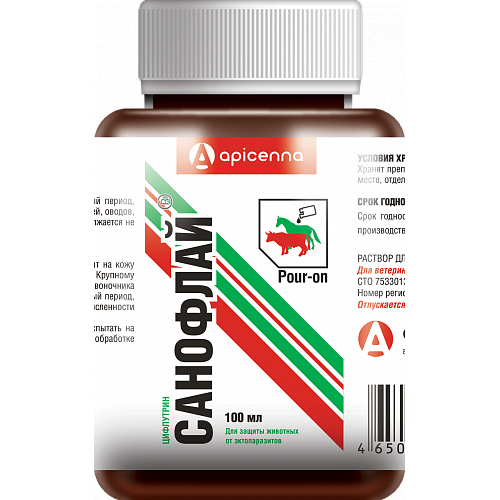 Санофлай — препарат для защиты крупного рогатого скота и лошадей от двукрылых насекомых и блох.Саноф..