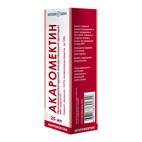 Акаромектин относится к противопаразитарным препаратам группы макроциклических лактонов. Ивермектин, входящий в состав препарата, активен в отношении личиночных и половозрелых фаз развития саркоптоидных клещей (Sarcoptes cariis, Sarcoptes vulpis, Notoedres cati, Otodectes cynotis, Psoroptes cuniculi), демодекозных клещей (Demodex canis), а также насекомых (Ctenocephalides canis, Ctenocephalides felis, Linognathus setotus, Trichodectes canis), паразитирующих на собаках и кошках. Механизм действия ивермектина заключается в его воздействии на величину тока ионов хлора через мембраны нервных и мышечных клеток паразита. Основной мишенью являются глютаматчувствительные хлорные каналы, а также рецепторы гамма-аминомасляной кислоты. Изменение тока ионов хлора нарушает проведение нервных импульсов, что приводит к параличу и гибели паразита. При нанесении препарата на кожу ивермектин оказывает контактное действие в местах локализации эктопаразитов (на коже, в волосяных луковицах и сальных железах), а после всасывания - системное инсектоакарицидное действие. Хорошо переносится собаками и кошками разных пород и возраста. Токсичен для пчел, а также рыб и других гидробионтов.