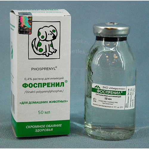 Препарат вводят главным образом внутримышечно. При лечении вирусных инфекций собак разовая доза фоспренила составляет 0,1 мл на 1 кг массы тела. При лечении вирусных инфекций кошек разовая лечебная доза фоспренила составляет 0,2 мл на 1 кг массы тела. При тяжелых и среднетяжелых клинических формах вирусных инфекций разовая лечебная доза фоспренила должна быть удвоена: собакам — 0,2 мл на 1 кг массы тела; кошкам — 0,4 мл на 1 кг массы тела. Возможно применение препарата внутрь собакам и кошкам, при этом следует использовать разовую дозу, увеличенную в 2 раза по отношению к внутримышечной. При лечении вирусных заболеваний телят разовая внутримышечная доза составляет 0,1 мл на 1 кг массы тела. При лечении вирусных энтеритов поросятам-сосунам массой 3 – 5 кг вводят внутримышечно в течение 8 суток по 0,5 мл фоспренила. Схема лечения зависит от вида заболеваний. Универсальный курс при тяжелых формах чумы плотоядных у собак, панлейкопении и инфекционном перитоните у кошек состоит из 40 доз: с 1-го по 2-й день – 4 дозы в сутки (через каждые 6 часов), с 3-го по 10-й день – 3 дозы в сутки (через каждые 8 часов), с 11-го по 13-й день – 2 дозы в сутки (через каждые 12 часов), 14-й и 15-й дни – 1 доза в сутки. При среднетяжелых формах чумы плотоядных у собак, панлейкопении и инфекционном перитоните у кошек, а также при парвовирусом энтерите и гепатите у собак применяется следующая схема лечения: в 1-й день – 4 дозы в сутки (через каждые 6 часов), со 2-го по 8-й день – 3 дозы в сутки (через каждые 8 часов), с 9-го по 11-й день – 2 дозы в сутки (через каждые 12 часов), с 12-го по 15 день – 1 доза в сутки. При легком течении тех же вирусных инфекций, а также при аденовирозах у собак и вирусном ринотрахеите у кошек принципиальная схема лечения остается такой же, но общая продолжительность курса сокращается до 3 – 7 суток: в 1-й день (либо в первые 2 – 3 дня) – 3 дозы в сутки (через каждые 8 часов), во 2-й день (либо на 3 – 5-й дни) – 2 дозы в сутки (через каждые 12 часов), на 3-й день (либо на 5 – 7-й дни) – 1 доза в сутки. При легком течение чумы плотоядных (начальная стадия) общая продолжительность лечения должна быть не менее 2-недель. При лечении вирусных заболеваний телят применяется следующая схема: в 1-й день – 4 инъекции в сутки (через каждые 6 часов), со 2-го по 4-й день – 3 инъекции в сутки (через каждые 8 часов), на 5-й день – 2 инъекции в сутки (через каждые 12 часов). При необходимости курс лечения можно продлить до 7 суток, вводя по разовой дозе препарата 2 раза в день. При лечении вирусных энтеритов поросят применяется следующая схема лечения: в 1-й день – 4 инъекции в сутки (через каждые 6 часов), со 2-го по 4-й день – 3 инъекции в сутки (через каждые 8 часов), с 5-го по 7 день – 2 инъекции в сутки (через каждые 12 часов), на 8-й день – 1 инъекция в сутки. Лечебную схему можно корректировать в зависимости от тяжести заболевания и особенности индивидуальной чувствительности организма. При необходимости возможно назначение повторных курсов лечения. При тяжелых и среднетяжелых клинических формах вирусных инфекций необходимо применять фоспренил в сочетании с антибиотиками, противогистаминными препаратами и симптоматической терапией, направленной на коррекцию водно-солевого и кислотно-щелочного равновесия, детоксикацию организма, нормализацию температуры тела и поддержание жизненно важных органов. Дополнительного применения имм