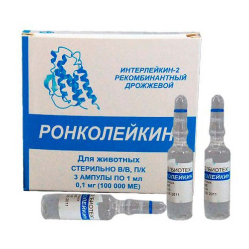Ронколейкин - высокоэффективный и безопасный препарат для иммунокоррекции дисфункций иммунной системы у животных. Ронколейкин® используется для лечения мелких домашних животных, лошадей, с/х животных, птицы и рыб. Применяется в виде монотерапии или как компонент комплексной терапии у животных любого возраста при следующих заболеваниях и состояниях: гнойно-воспалительных, инфекционных, кожных, респираторных, онкологических заболеваниях, при стрессе (транспортировка и др. манипуляции), в качестве адъюванта вакцин.