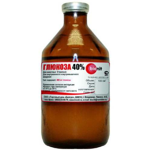 Токсикоинфекции, инфекционные заболевания, различные интоксикации (отравления наркотиками, синильной кислотой и ее солями, окисью углерода, анилином, мышьяковистым водородом и другими веществами), заболевания печени (гепатит, цирроз, дистрофия и атрофия печени), декомпенсация сердечной деятельности, отек легких, геморрагический диатез и многие другие патологические состояния. У жвачных животных назначают при желудочно-кишечных заболеваниях с явлениями интоксикации, гипотонии, атонии преджелудков, а также при ацетонемии, послеродовой гемоглобинурии, кетонурии и токсемии. Растворы глюкозы назначают слабым и истощенным животным как энергетическое и диетическое средство.