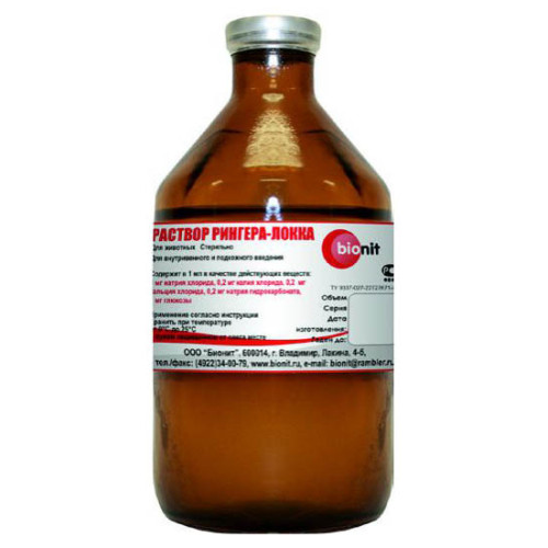 Раствор Рингера-Локка изотоничен плазме крови животных, регулирует водно-солевое и кислотно-щелочное равновесие в организме животных. После введения препарата быстро всасывается из места инъекции и распределяется в органах и тканях животного. Препарат не оказывает раздражающего действия на ткани.