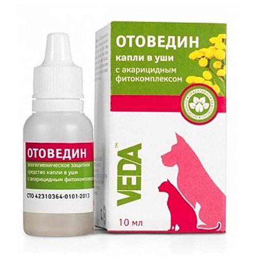 Oтовeдин пpимeняют для лeчeния отодeктозa (ушной чeсотки) собaк, кошeк и пушныx звepeй.