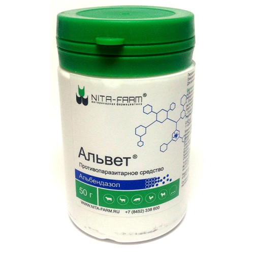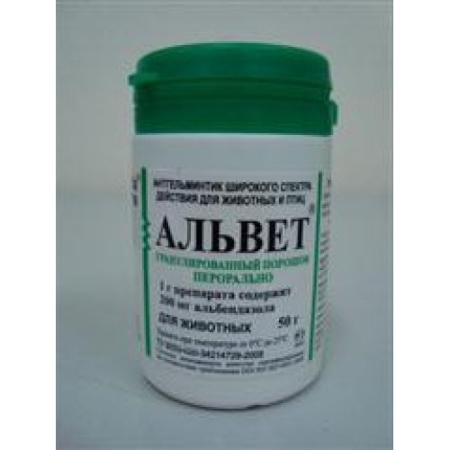 Альвет назначают без предварительной голодной диеты, индивидуально или групповым способом в смеси с концентрированными кормами крупному рогатому скоту, овцам, свиньям и собакам однократно, птице двукратно. Крупному рогатому скоту препарат применяют индивидуально в следующих дозах: при мониезиозе, легочных и желудочно-кишечных нематодозах 3,75 г на 100 кг массы животного (7,5 мг/кг альбендазола); при хроническом фасциолезе 5,0 г на 100 кг (10 мг/кг альбендазола). Овцам препарат применяют индивидуально или групповым способом в следующих дозах: при мониезиозе, легочных и желудочно-кишечных нематодозах 2,5 г на 100 кг массы животного (5 мг/кг альбендазола); при хроническом фасциолезе 3,75 г на 100 кг массы животного (7,5 мг/кг альбендазола); при хроническом дикроцеллиозе 7,5 г на 100 кг массы животного (15 мг/кг альбендазола). При групповом способе применения навеску альвета, рассчитанную на группу не более 150 овец, тщательно смешивают с комбикормом (из расчета 50 – 100 г комбикорма на животное). Смесь раскладывают в кормушки, обеспечивая животным свободный доступ к ним. Свиньям препарат применяют при аскаридозе и эзофагостомозе групповым способом с концентрированными кормами в утреннее кормление в дозе 5,0 г на 100 кг массы животного (10 мг/кг альбендазола). Препарат в дозе, рассчитанной на группу не более чем 50 свиней, смешивают с половиной нормы корма и раскладывают по кормушкам, обеспечивая животным свободный доступ к ним. Лошадям препарат назначают при параскариозе, стронгилятозе, альфортиозе, делафондиозе, аноплоцефалезе и циатостомозах индивидуально в дозе 3,75 г на 100 кг массы животного (7,5 мг/кг альбендазола). Собакам препарат применяют индивидуально при нематодозах в дозе 0,375 г на 10 кг массы животного (7,5 мг/кг альбендазола), при цестодозах в дозе 0,75 г на 10 кг массы животного (15 мг/кг альбендазола). Птице препарат применяют при аскаридиозе и гетеракидозе два дня подряд, групповым способом в смеси с комбикормом в утреннее кормление, в дозе 0,5 г на 10 кг массы птицы (10 мг/кг альбендазола). Перед массовой дегельминтизацией каждую серию препарата предварительно испытывают на небольшой группе животных (10 – 15 голов). При отсутствии в течение 3 суток осложнений приступают к обработке всего поголовья.