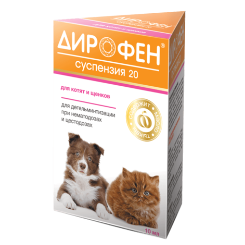 11. Дирофен-суспензию 20 назначают взрослым кошкам, щенкам и котятам с 3-недельного возраста, хорькам и декоративным грызунам (хомякам, морским свинкам, крысам) с 3 – 4 недельного возраста, Дирофен-суспензию 60 – взрослым собакам, с профилактической и лечебной целью при нематодозах (токсокароз, токсаскаридоз, унцинариоз, трихоцефалез, анкилостомоз), цестодозах (тениидоз, дипилидиоз, эхинококкоз, дифиллоботриоз, мезоцестоидоз) и смешанных нематодо-цестодозных инвазиях.