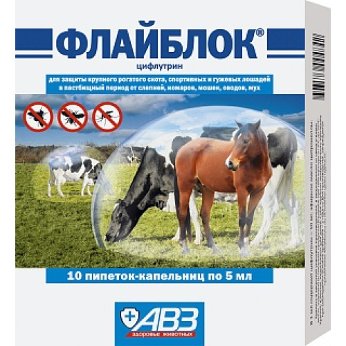 ФЛАЙБЛОК® применяют для защиты крупного рогатого скота, спортивных и гужевых лошадей в пастбищный период от нападения двукрылых насекомых - слепней, оводов, комаров, мошек и зоофильных мух.