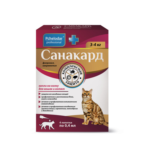 Санакард для кошек и котят 3-4кг, 0,4мл (в уп.4 пип) от блох, клещей, отодек, демод, сарк, немат