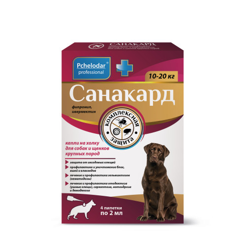 Санакард для собак и щенков крупных.пород 10-20кг, 2мл (в уп.4 пип) от блох, клещей, отодек,