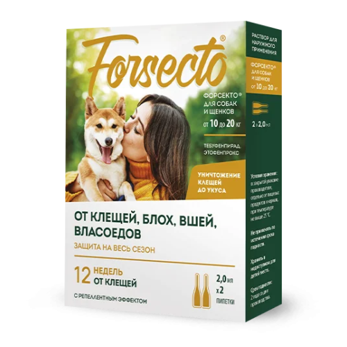 Форсекто капли инсектоакарицидные для собак и щенков от 10 до 20кг, 2мл от блох, клещей 2пип