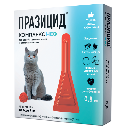 Празицид-комплекс НЕО для кошек 4-8кг(1 пип/0,8мл)(от блох,клещей,вшей,влас,гельминтов)