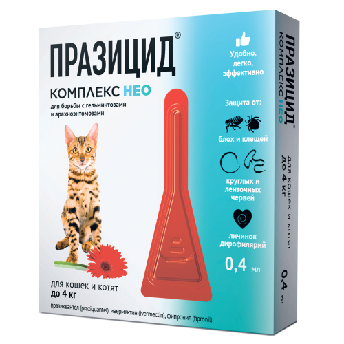 Празицид-комплекс НЕО для кошек и котят до 4кг (1пип/0,4мл)(от блох,клещей,вшей,влас.,гельминтов)*10