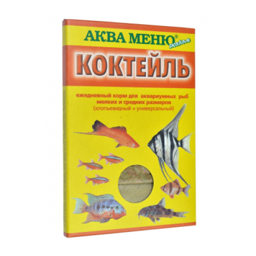 «КОКТЕЙЛЬ» — ежедневный корм для аквариумных рыб мелких и средних размеров (2 — 10 см): живородящих, цихлид, харациновых, лабиринтовых, карповых, различных сомов и др. «Коктейль» состоит из двух пакетов: