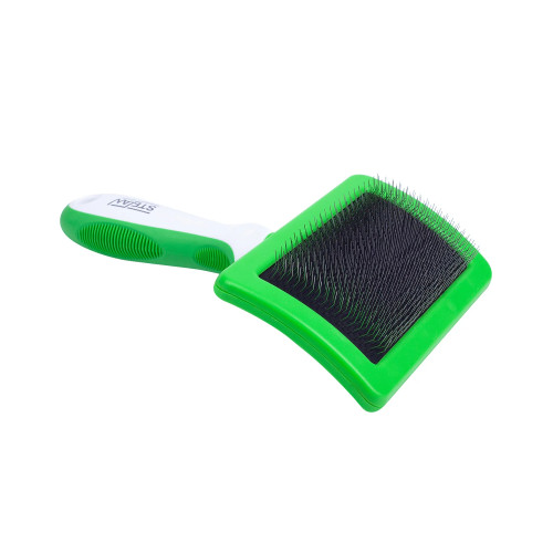 Прочная пластиковая рабочая поверхность оснащена зубьями из высококачественной нержавеющей стали. Зубья проникают глубоко в шерсть и удаляют выпавшие волоски из подшерстка.