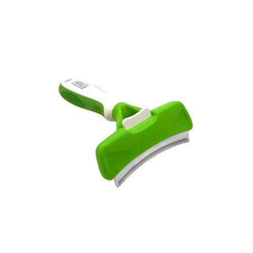 Самоочищающийся дешеддер с изогнутым лезвием удаляет большее количество волосков, при этом не травмируя и не причиняя дискомфорта животному во время процедуры. Дешеддер - инструмент предназначенный для вычесывания животных. Стальные лезвия дешеддера проникают глубоко внутрь шерсти и удаляют выпавшие волоски, частички грязи с поверности и из подшерстка животного. Уникальные закругленная форма дешеддера лучше скользит по телу животного, увеличивая область соприкосновения между лезвием и шерстью, что обеспечивает более быстрый и эффективный процесс вычесывания. Для удаления скопившейся на лезвии шерсти, достаточно нажать одну кнопку. Противоскользящая ручка с эргономичным дизайном сделает процедуру ухода за питомцем комфортной и удобной для Вас.