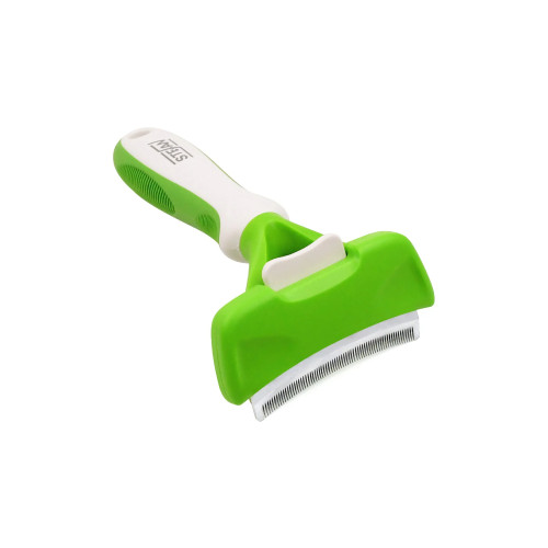 Самоочищающийся дешеддер с изогнутым лезвием удаляет большее количество волосков, при этом не травмируя и не причиняя дискомфорта животному во время процедуры. Дешеддер - инструмент предназначенный для вычесывания животных. Стальные лезвия дешеддера проникают глубоко внутрь шерсти и удаляют выпавшие волоски, частички грязи с поверности и из подшерстка животного. Уникальные закругленная форма дешеддера лучше скользит по телу животного, увеличивая область соприкосновения между лезвием и шерстью, что обеспечивает более быстрый и эффективный процесс вычесывания. Для удаления скопившейся на лезвии шерсти, достаточно нажать одну кнопку. Противоскользящая ручка с эргономичным дизайном сделает процедуру ухода за питомцем комфортной и удобной для Вас.