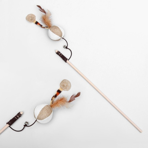 Игрушка для кошек дразнилка с мягким шариком и перьями деревянная ручка 40см Пижон