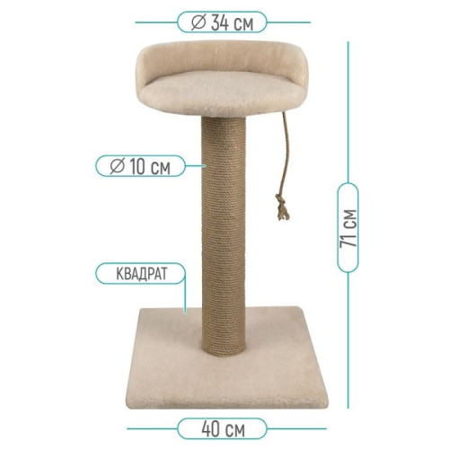 Основание выполнено из ДСП, обшит качественным искусственным мехом. Столбик изготовлен из картонной гильзы, поверх которого намотана джутовая веревка. Изделие имеет дополнительную полку с бортиком. Основание: 40см * 40см = 1шт Полка: ширина - 34см = 1шт Столбик: высота 58см = 1шт, диаметр = 10см Габариты: (Д*В*Ш) 40см * 70см * 40см