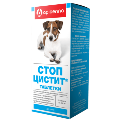 Состав: Стоп-цистит — комплексный препарат для лечения и профилактики урологических заболеваний у собак в форме таблеток для применения внутрь. В 1 таблетке содержится: 25 мг нитроксолина, 30 мг дротаверина гидрохлорида, 10 мг экстракта плодов можжевельника, 10 мг экстракта травы горца птичьего, 10 мг экстракта листьев крапивы, 10 мг экстракта корня солодки, 10 мг экстракта листьев брусники,10 мг экстракта березовых листьев, а также вспомогательные компоненты. По внешнему виду препарат представляет собой таблетки массой 200 мг для применения внутрь. Расфасовывают по 20 таблеток в полимерные банки, упакованные в картонные коробки.