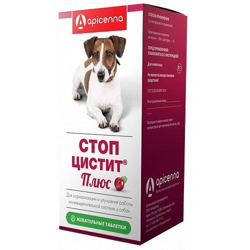 Стоп-цистит Плюс для собак. В 1 таблетке содержится: метионин 180 — 220 мг, L-теанин 45 — 55 мг, триптофан 9 — 11 мг, экстракт клюквы сухой 45 — 55 мг, экстракт брусники листа сухой 45 — 55 мг, автолизат пивных дрожжей 18 — 22 мг, а также вспомогательные вещества.