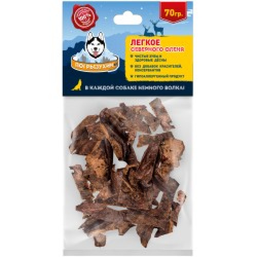 Состав: 100% легкое северного оленя.Пищевая ценность на 100г продукта: белок 15,6 г., жиры 2,3 г.Эне..