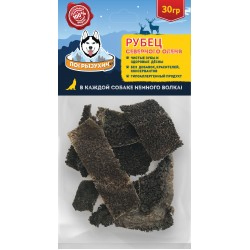 Состав: 100% рубец желудка северного оленя.Пищевая ценность на 100г продукта: белок 16,8г, жиры 11,..