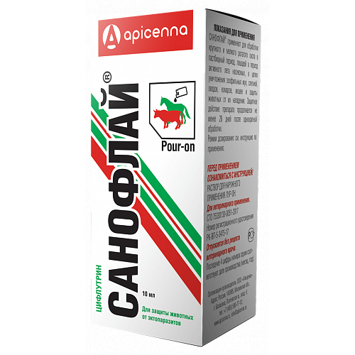 В качестве действующих веществ Санофлай в 1 мл содержит: цифлутрин – 10 мг, вспомогательные вещества до 1 мл.