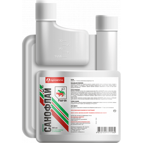 Крупному рогатому скоту и лошадям массой более 300 кг Санофлай наносят на кожу спины вдоль позвоночника от холки до крестца в дозе 10 мл на животное.