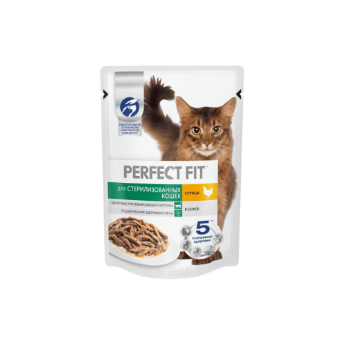 Влажный корм в паучах PERFECT FIT™ Sterile с курицей в соусе для стерилизованных кошек разработан по специальной рецептуре для контроля здоровья кошек, прошедших стерилизацию.
