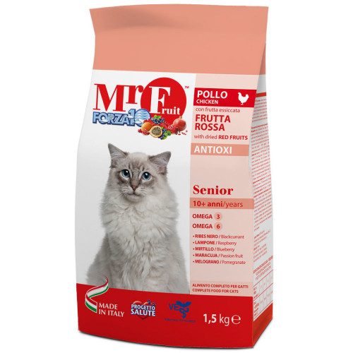 FORZA10 Mr. Fruit Senior с красными фруктами — это корм, специально разработанный для пожилых кошек: контролирует получаемое количество белков и жиров, что способствует правильному обмену питательных веществ, а также защите организма.