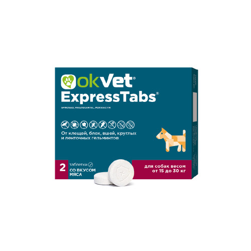 Оквет экспресстабс для собак от клещей, блох, вшей, круглых и ленточных гельминтов 15-30кг 2 таб.